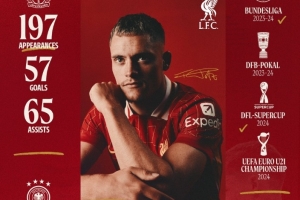 利物浦官推晒出了维尔茨职业生涯迄今为止的一些数据和荣誉。维尔茨共为勒沃库森出战197场比赛,打进57球并送出65次助攻。在国家队层面,他为德国出战31场比赛,有7球入账。